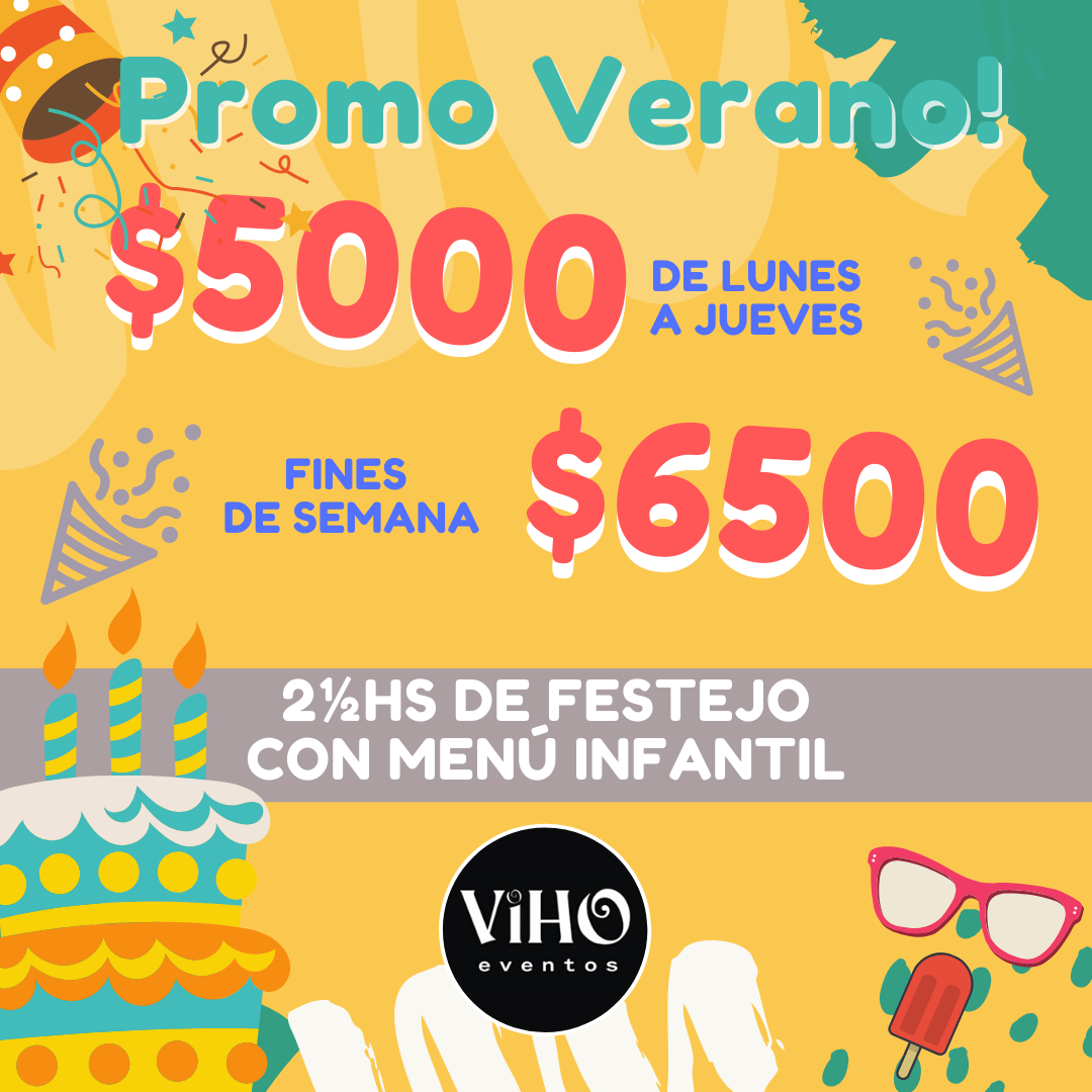 Cumplis años en Enero, Febrero! aprovecha las promos de Viho Eventos. $5000 de Lunes a Jueves y $6500 los Fines de Semana. Cumpleaños de 2½hs, 30 Chios y 25 adultos, con menú infantil, Piñana y Glob...